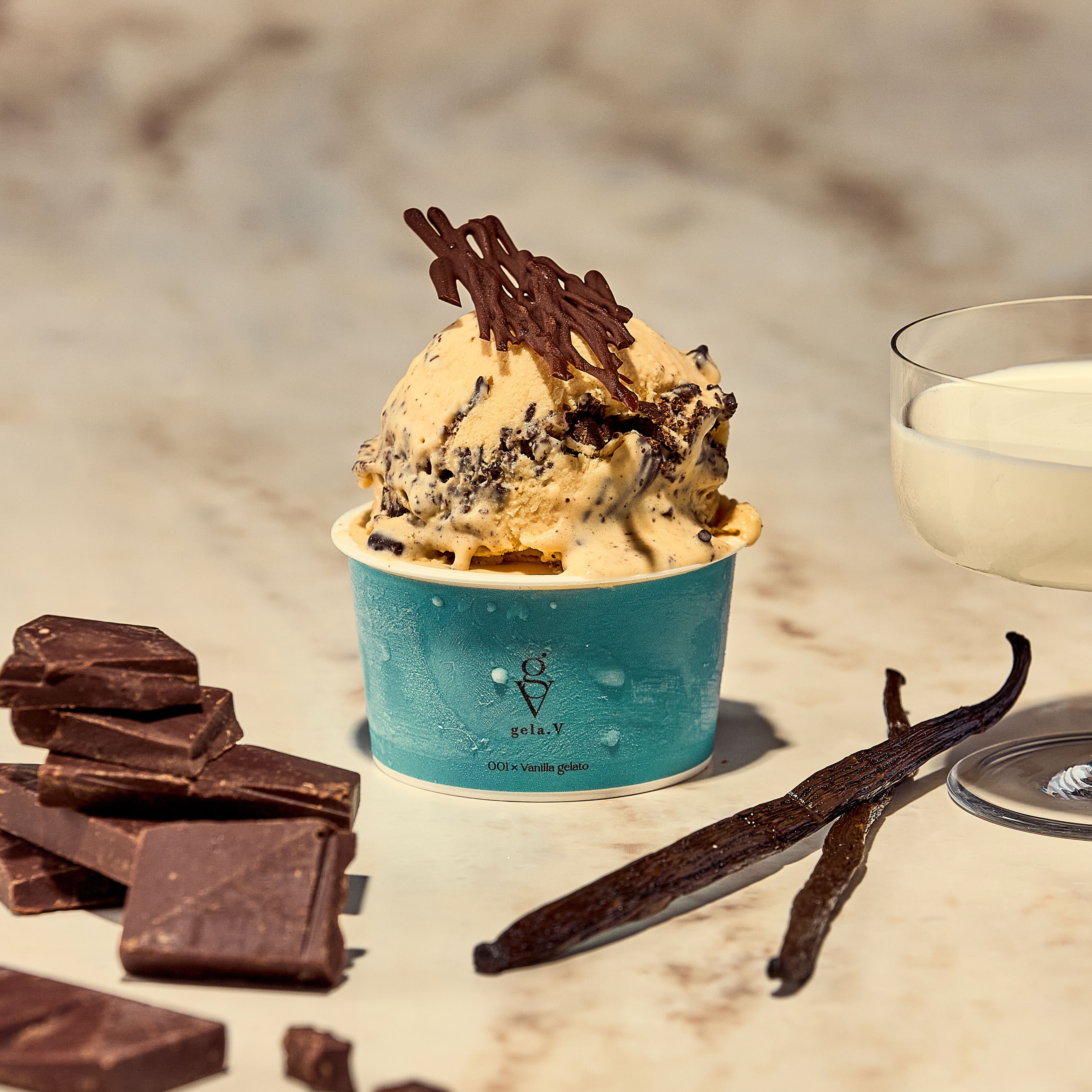 マダガスカル産のブルボンバニラビーンズをふんだんに使用したバニラジェラートに001ダークチョコレートを混ぜ、パリッとした繊細な食感でバニラジェラートとのバランスが絶妙な口溶けに。シンプルかつ濃厚な優しい味わい。