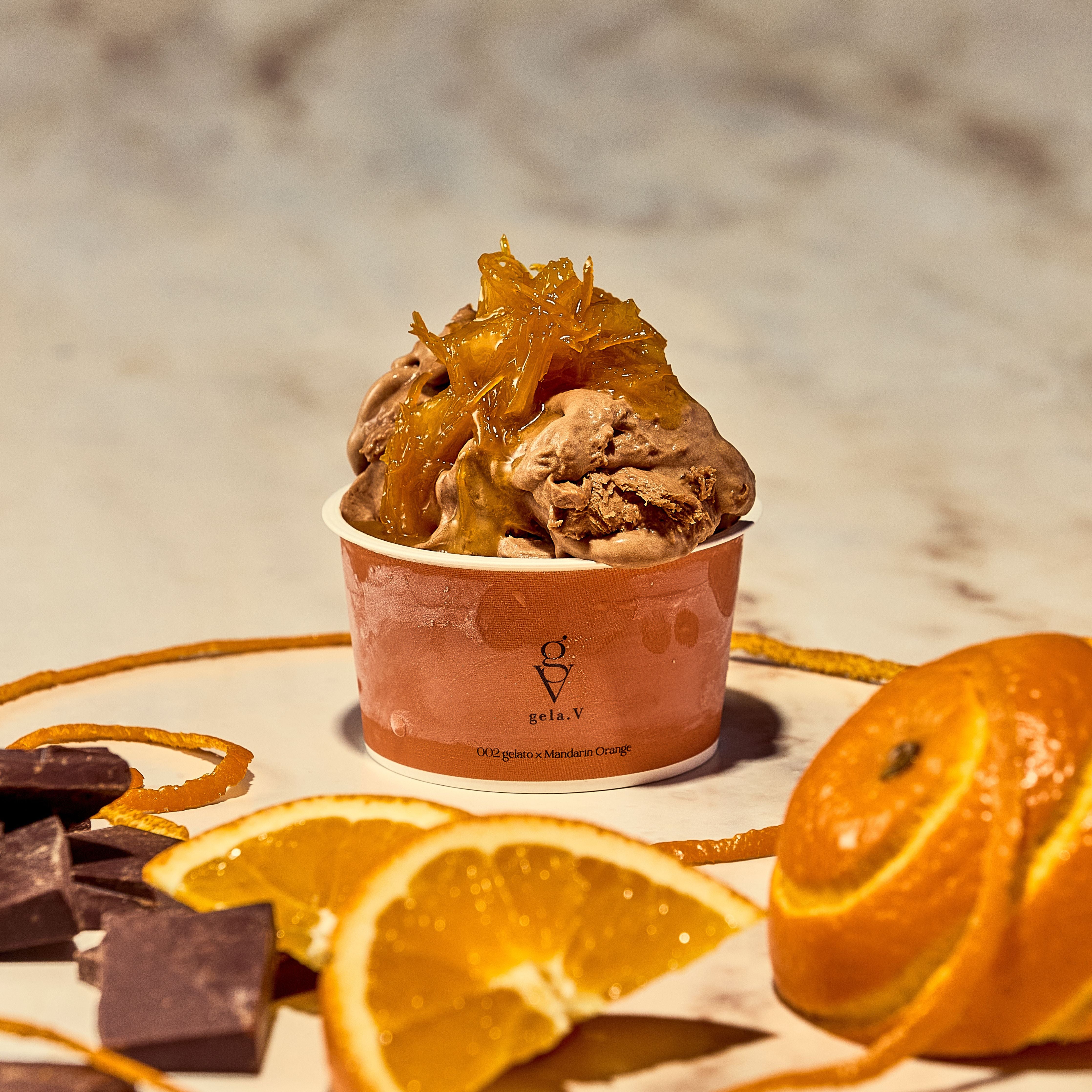 果肉、ピューレ、ピール、果汁も入って甘さの中にフレッシュなオレンジの風味をやさしく口いっぱいに感じられる爽やかなジェラート。